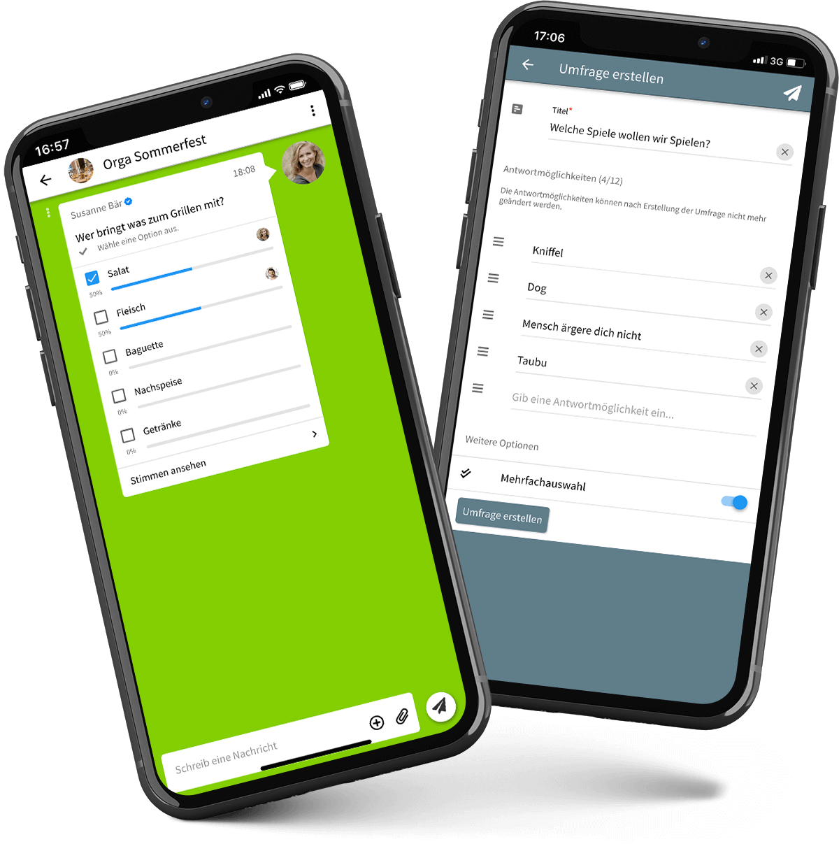 Du kannst jetzt innerhalb von Beiträgen oder Gruppenchats Umfragen erstellen. Dazu findest du im Chatbereich neben der Klammer ein “Plus”. Mit einem Klick darauf kannst du eine Umfrage erstellen. Wähle einen Titel, die Antwortmöglichkeiten und entscheide, ob die Teilnehmenden mehrere Antworten auswählen können.
