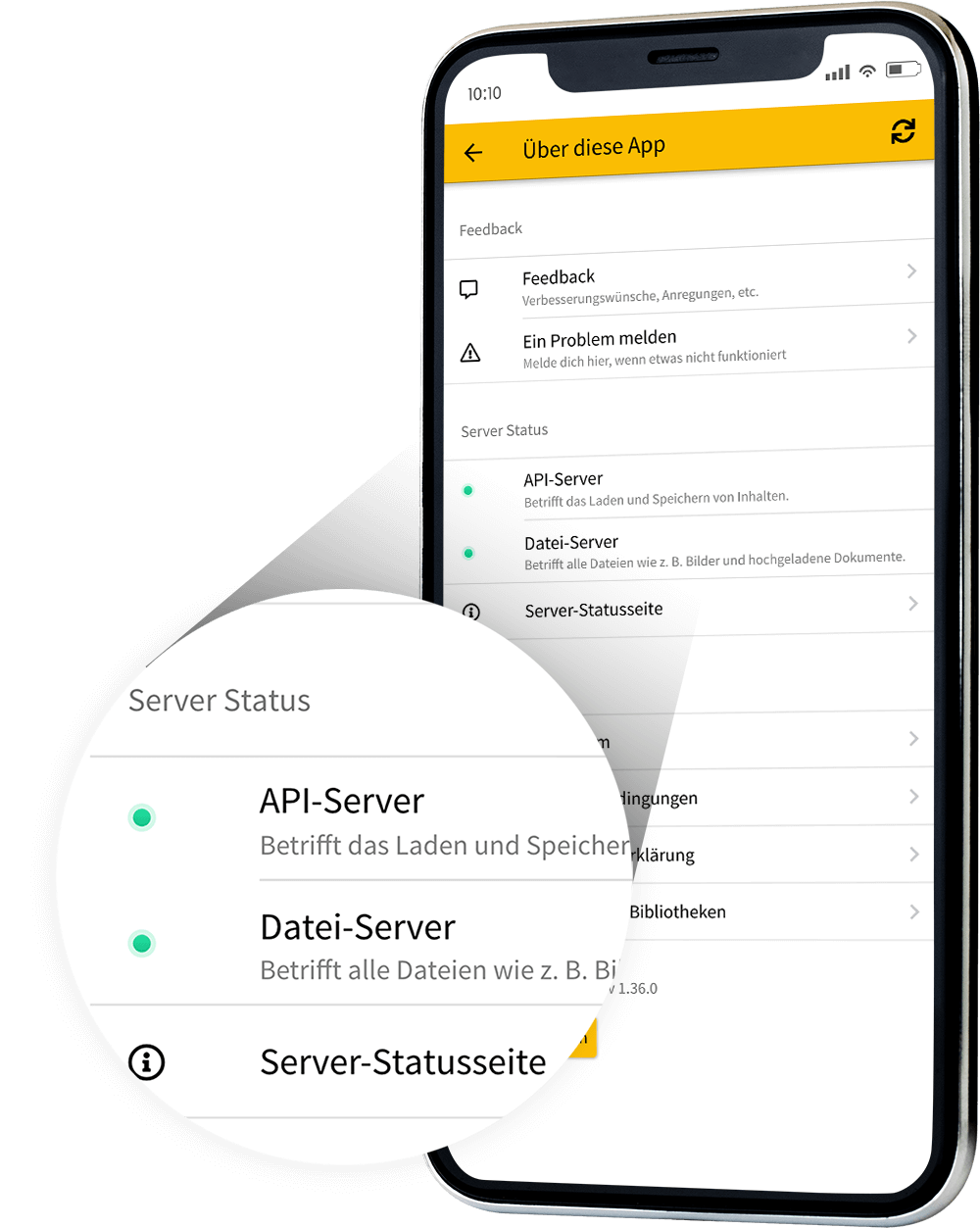 Den Serverstatus kannst du jetzt auch in der App überprüfen. Dazu gehst du rechts in der App auf “Über”. Hier findest du den Serverstatus zu API-Server, Datei-Server und der generellen Server-Statusseite.